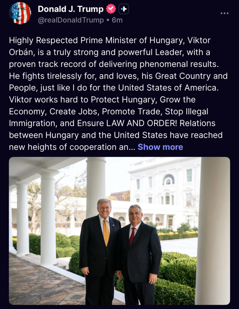 Donald Trump azt írta, „Magyarország nagyra becsült miniszterelnöke, Orbán Viktor igazán erős és határozott vezető, aki már számtalanszor bizonyította, hogy kivételes eredményeket tud elérni. Fáradhatatlanul küzd érte és szereti nagyszerű hazáját és népét, ahogyan én is ezt teszem az Amerikai Egyesült Államokért. Viktor keményen dolgozik Magyarország védelméért, a gazdaság növekedéséért, a munkahelyteremtésért, a kereskedelem fellendítéséért, az illegális bevándorlás megállításáért, valamint a törvény és a rend fenntartásáért. Elnökségem alatt Magyarország és az Egyesült Államok kapcsolata új szintre lépett az együttműködés és a látványos eredmények terén, nagyrészt Orbán Viktor miniszterelnöknek köszönhetően. Nagy várakozással tekintek arra, hogy továbbra is szorosan együtt dolgozzunk annak érdekében, hogy mindkét ország tovább haladhasson ezen a kivételes úton, amely a sikerhez és az együttműködéshez vezet. Büszke voltam rá, hogy 2022-ben támogattam Viktor újraválasztását, és most ismét megtiszteltetés számomra, hogy ezt megtehetem. Orbán Viktor igazi barát, harcos és győztes, aki teljes, feltétlen támogatásomat élvezi miniszterelnöki újraválasztásához. Soha nem okoz csalódást Magyarország nagyszerű népének” – idézte az üzenetet bejegyzésben Orbán Viktor.