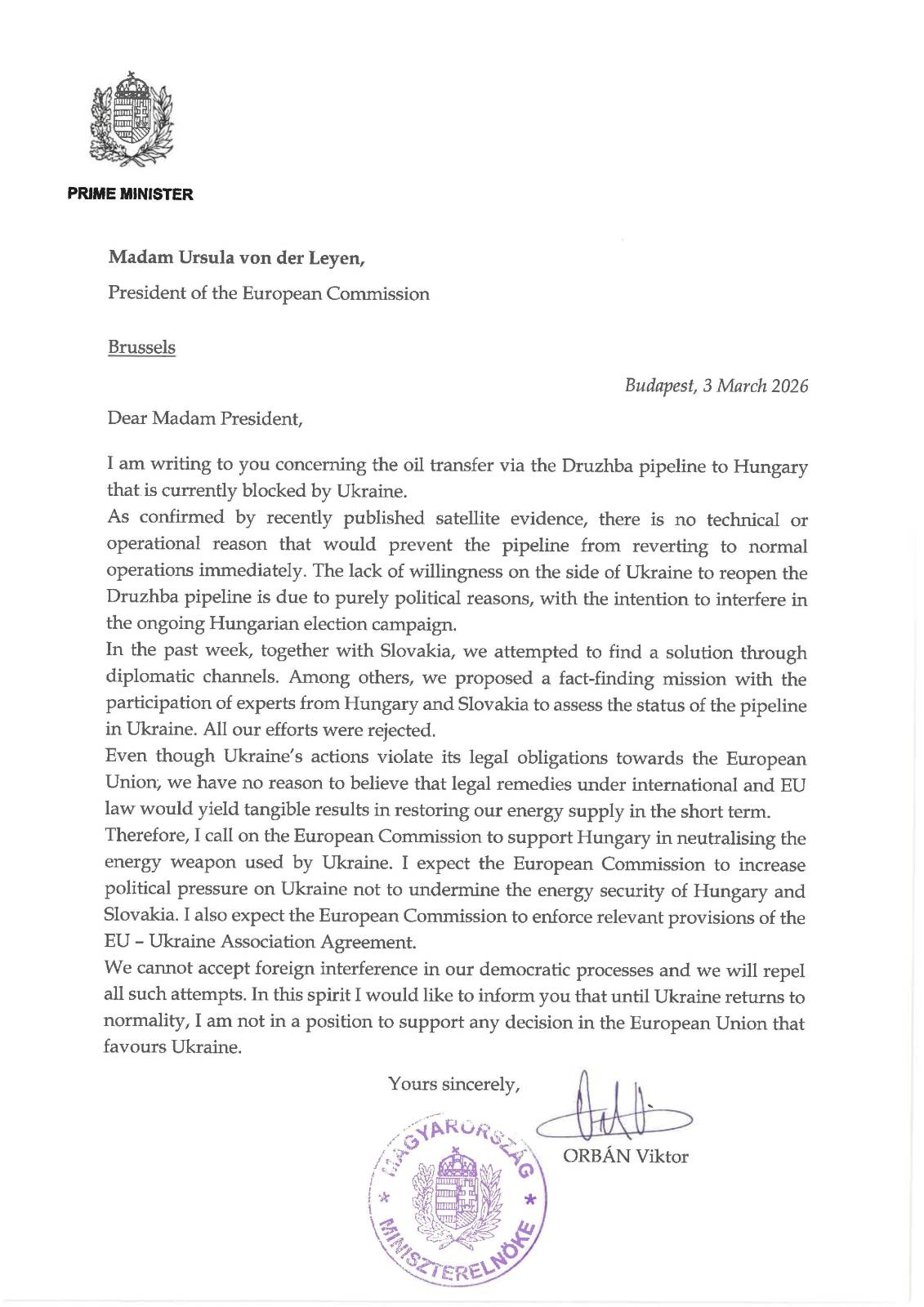 „Ezért felszólítom az Európai Bizottságot, hogy támogassa Magyarországot az ukrán energiafegyver hatástalanításában. Elvárom az Európai Bizottságtól, hogy fokozza a politikai nyomást Ukrajnára annak érdekében, hogy ne ássa alá Magyarország és Szlovákia energiabiztonságát. Elvárom az Európai Bizottságtól azt is, hogy szerezzen érvényt az EU-Ukrajna Társulási Megállapodásban foglaltaknak” – sorolta a miniszterelnök.